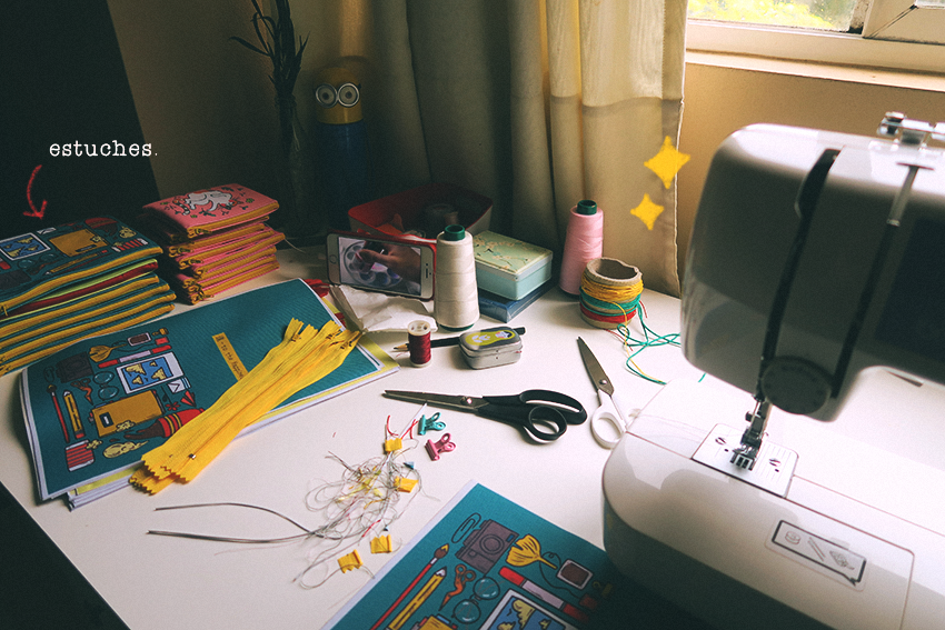 A días de la feria me puse a trabajar para tener todo terminado, admito que es un muy mal hábito que tengo desde la u, trabajar a poquitos días de la fecha límite hehe. Fui dos veces al centro para comprar los materiales y estuve cosiendo los estuches con la máquina de coser, donde me eché tres agujas (pero me enseñaron qué hay agujas de diferentes tipos, así que después conseguiré una para los cierres), pero logré terminar casi todos los estuches y monederos. También dibujé UN MONTÓN para tener nuevos diseños de stickers y postales, además de imprimir y cortar los marcapáginas, postales y stickers. En esto último gemeli me ayudó mucho.